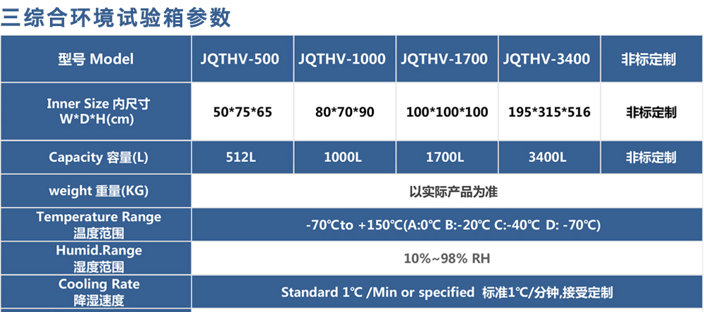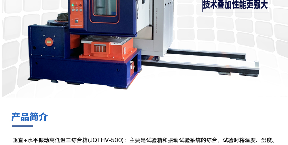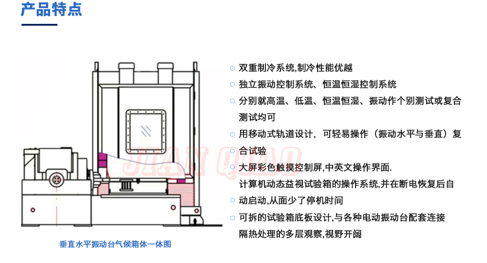 用途:垂直+水平振動高低溫三綜合箱(JQTHV-500):主要是試驗箱和振動試驗系統的綜合,試驗時將溫度、濕度、振動(高溫或低溫),(正弦振動或隨機振動)以及電應力按規定的周期綜合在同一氣候試驗箱中施加到樣品上進行溫度、濕度、振動的“環境仿真”試驗。